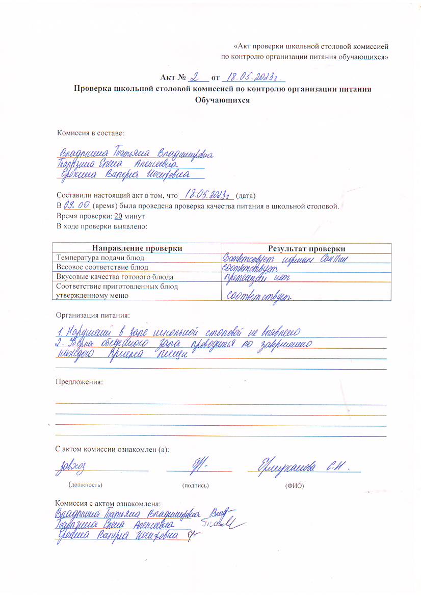 Акт № 2 от 18.05.2023 Проверка школьной столовой комиссией по контролю организации питания Обучающихся